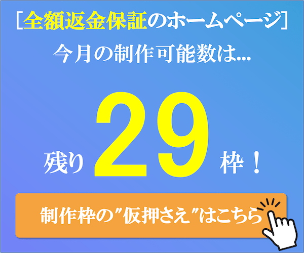 『低価格でハイクオリティ』『中身が充実』『制作が速い』『全部丸投げで安心』…それでも安心できない!その気持ち、よく分かります。そこで本サービスでは『全額返金保証』をお付けしました。どんな理由でも構いません、メール1本で初期費用+月額費用を全額お返しいたします。これは、私たちからの『安心保証』であり、『品質保証』です!※保証期限は、ホームページ公開から7日以内